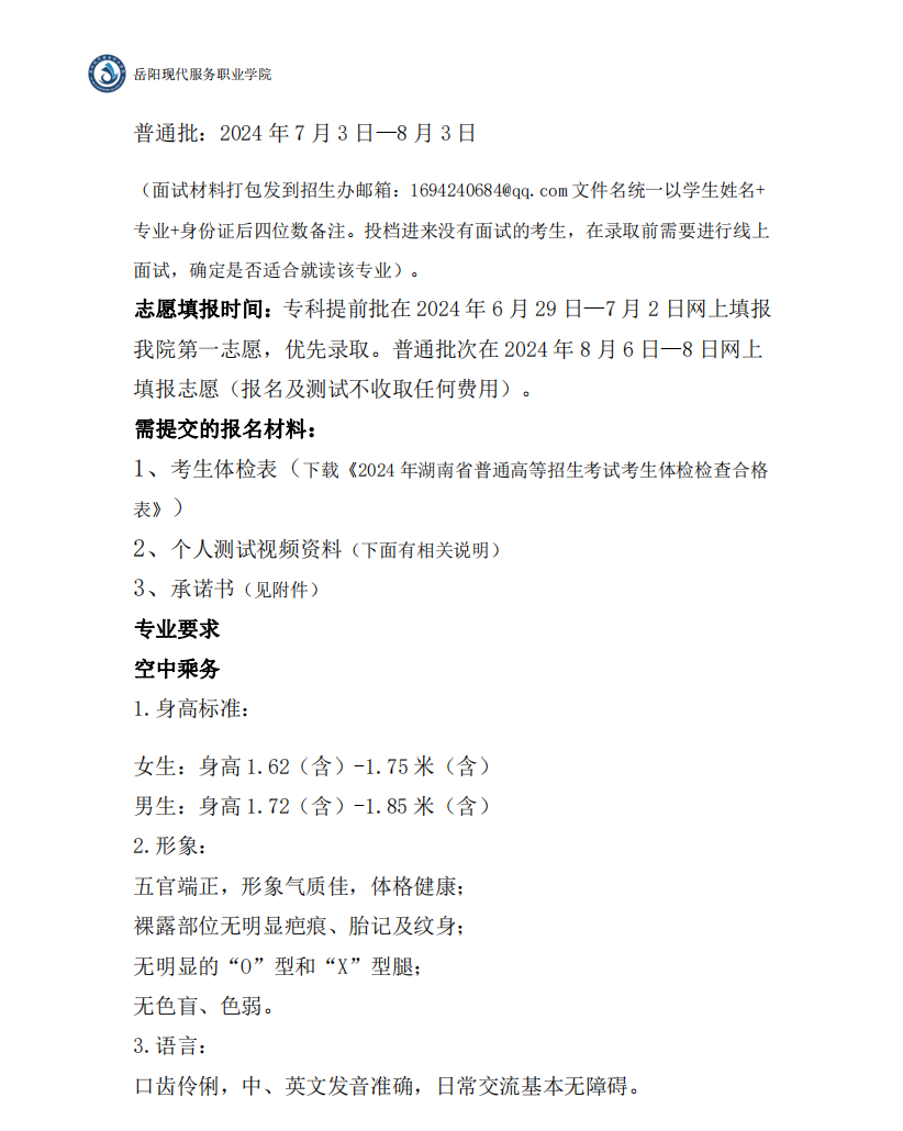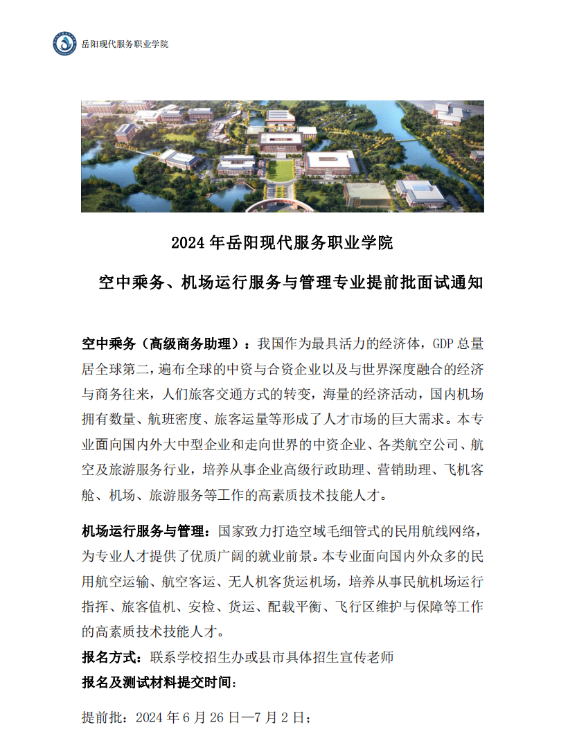 2024年岳阳现代服务职业学院 空中乘务、机场运行服务与管理专业提前批面试通知docx
