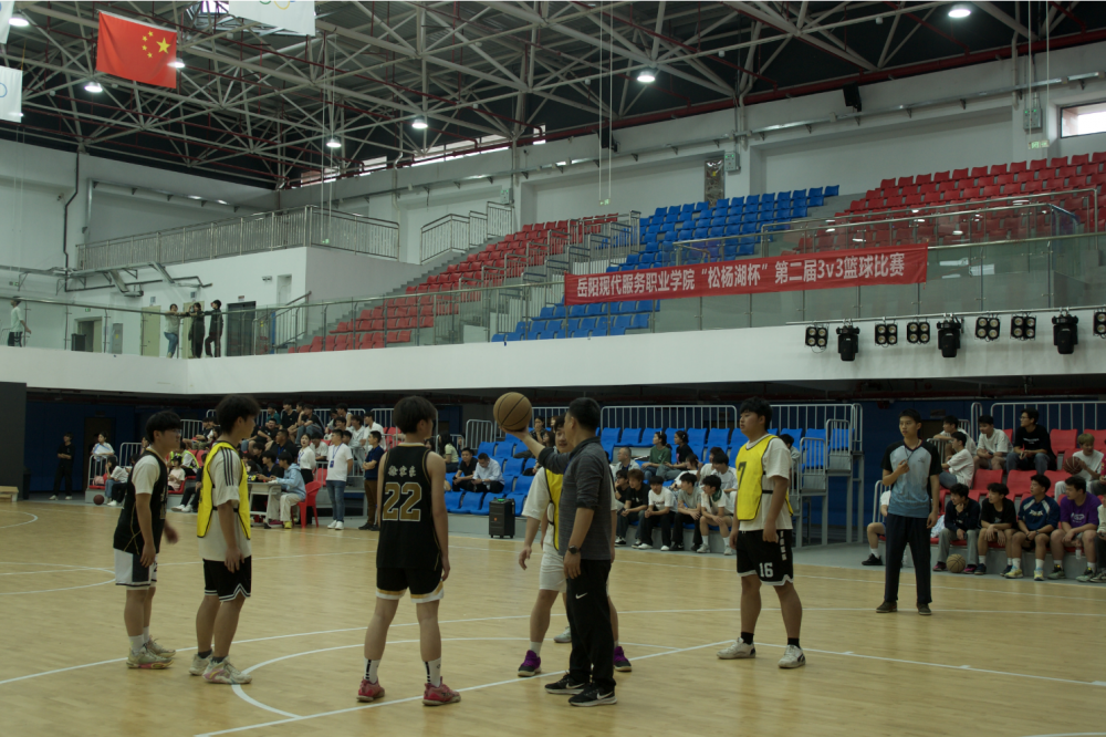 张莉副校长宣布:岳阳现代服务职业学院“松杨湖杯”第二届3V3篮球赛开始并为比赛开球,随着篮球在空中划出一道优美的弧线,全场响起热烈的掌声与欢呼声。